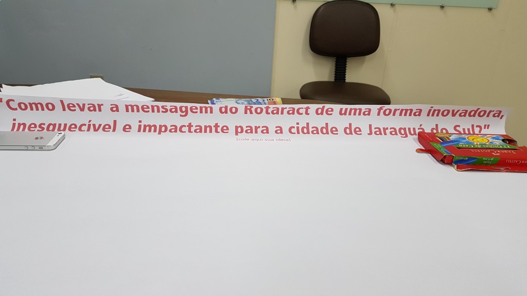 Para que todos os associados participassem de forma efetiva na concepção do projeto que acontecerá dos dias 12 a 18 de março, a proposta foi de reunir-se em duplas ou trios e discutirem ideias para responder a frase "Como levar a mensagem do Rotaract de uma forma inovadora, inesquecível e impactante para a cidade de Jaraguá do Sul".